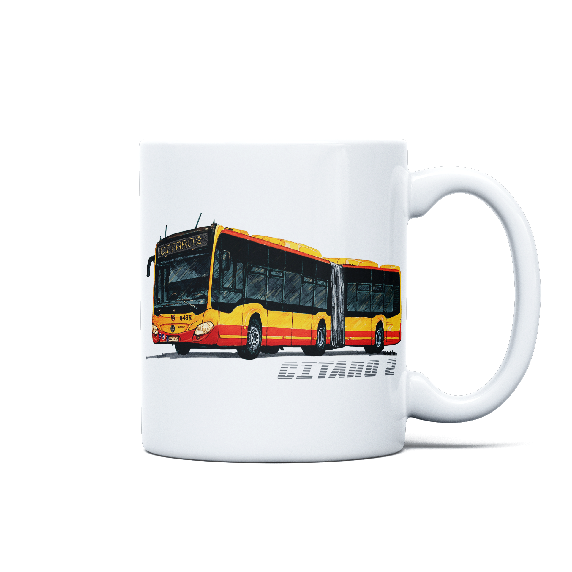 Introducing the Mercedes-Benz Citaro O530G — mug, where the elegance of public transport meets your morning coffee routine! This mug features a stunning hand-made illustration, capturing the sleek design of the Citaro O530G in vivid, durable prints. Perfect for those who appreciate the finer details of urban transit, this mug brings a touch of the city to your kitchen.